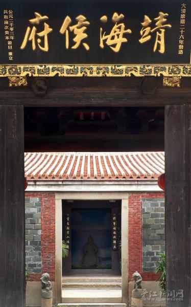 靖海侯府位于龙湖镇衙口村施氏大宗祠西侧,建于康熙二十八年1689年,为三落双护厝大型建筑,硬山式屋顶,五开间,计有房间六十多间。前附石庭院,后带花园,青砖面墙,出砖入石山墙,穿斗式建筑结构,是一座风格古朴、建筑精巧的闽南古建筑。规制宏大,占地面积,2500余平方米。