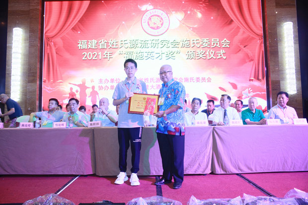 福建省姓氏源流研究会施氏委员会永远名誉会长施能辉为获奖学子颁奖(代领)